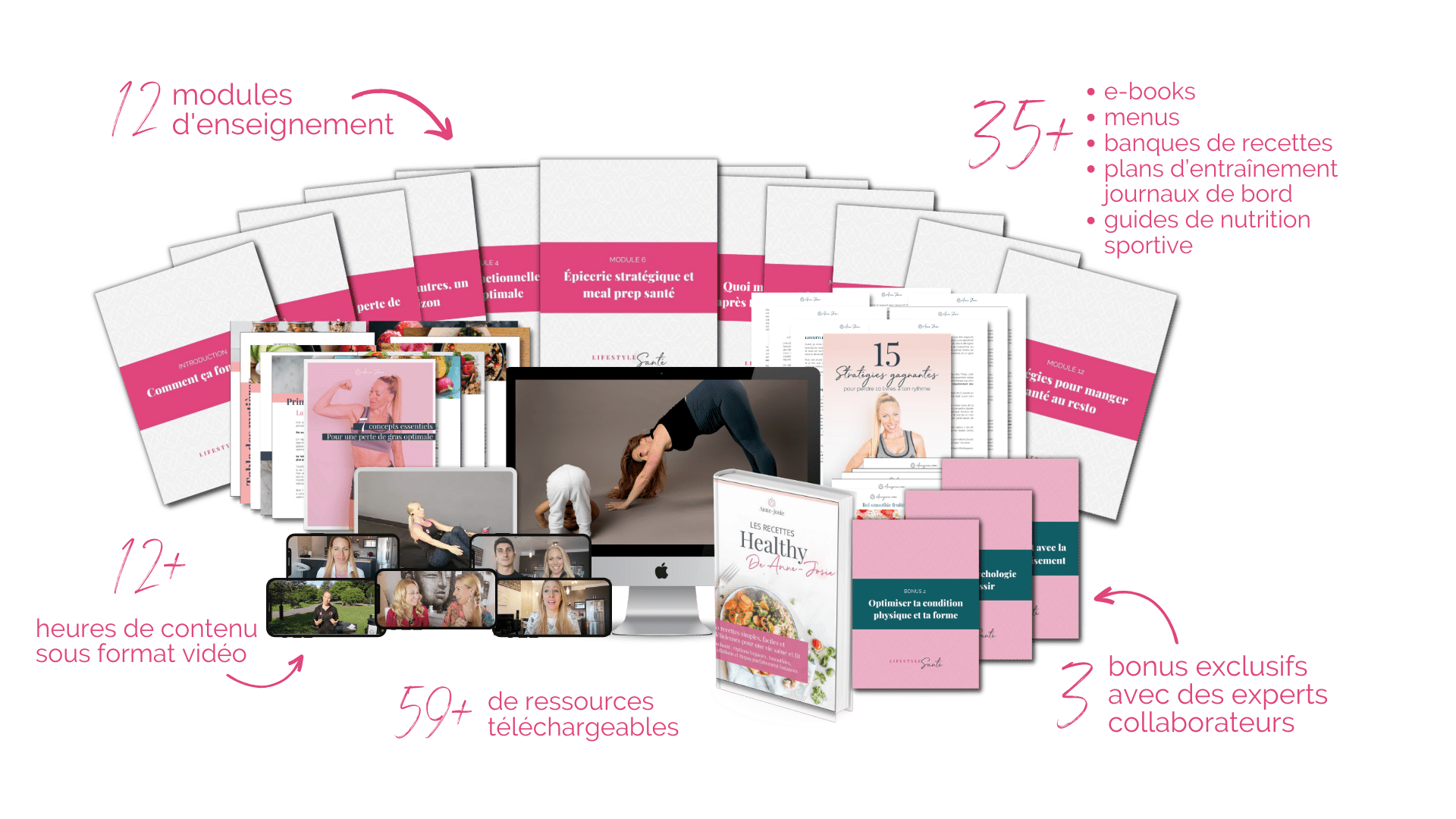 💗 Une foule de ressources téléchargeables : e-books, menus, banques de recettes, plans d’entraînement, journaux de bord, guides de nutrition sportive, etc.
